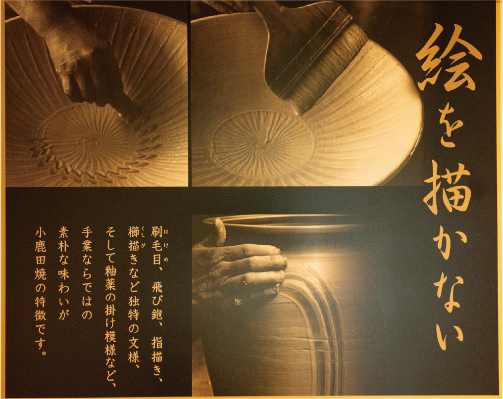 伝統的な装飾として「飛び鉋(かんな)」、「打ち刷毛目(はけめ)」、「指描き」、「櫛描(くしが)き」