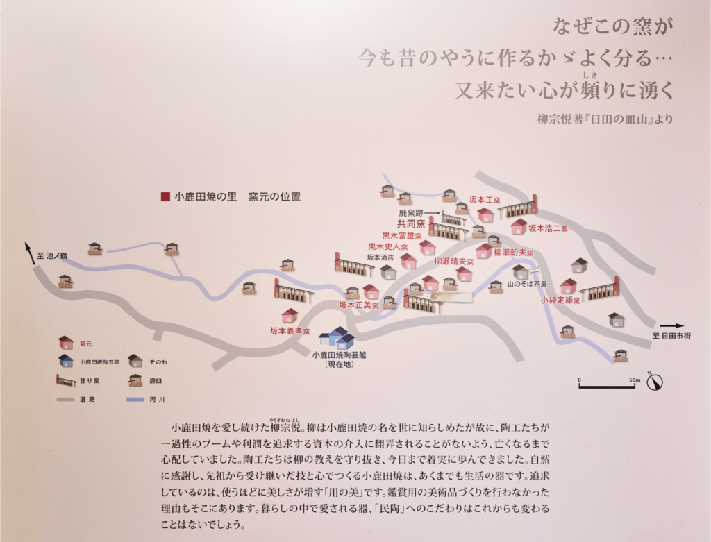 民藝運動※の創始者として有名な柳宗悦は、久留米で「日田もの」と呼ばれる陶器に出会います。昭和2年(1027)のことでした。4年後に小鹿田を訪れ、作業場や作品を目にした柳は、昔のままの朝鮮風の手法がゆがめられず、立派に残されていることに驚きます。伝統技法を受け継ぐ民陶として価値を見いだしたのです。昭和29年(1954)には世界的な陶芸家であるバーナード・リーチが里に3週間滞在。また、濱田庄司(はまだしょうじ)など民藝運動家たちの応援もあり、小鹿田焼は世に知られるようになります。民陶ブームにより小鹿田焼の需要は急増しましたが、窯元たちは手づくりの伝統を守り続ける道を選びました。