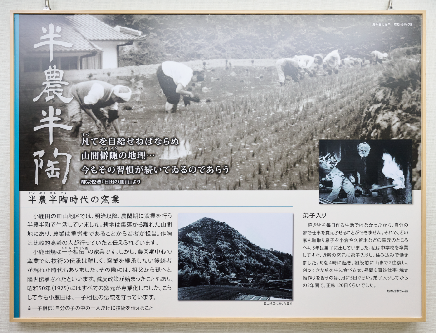 小鹿田の皿山地区では、明治以降、農閑期に窯業を行う半農半陶で生活していました。耕地は集落から離れた山間地にあり、農業は重労働であることから若者が担当。作陶は比較的高齢の人が行っていたと伝えられています。