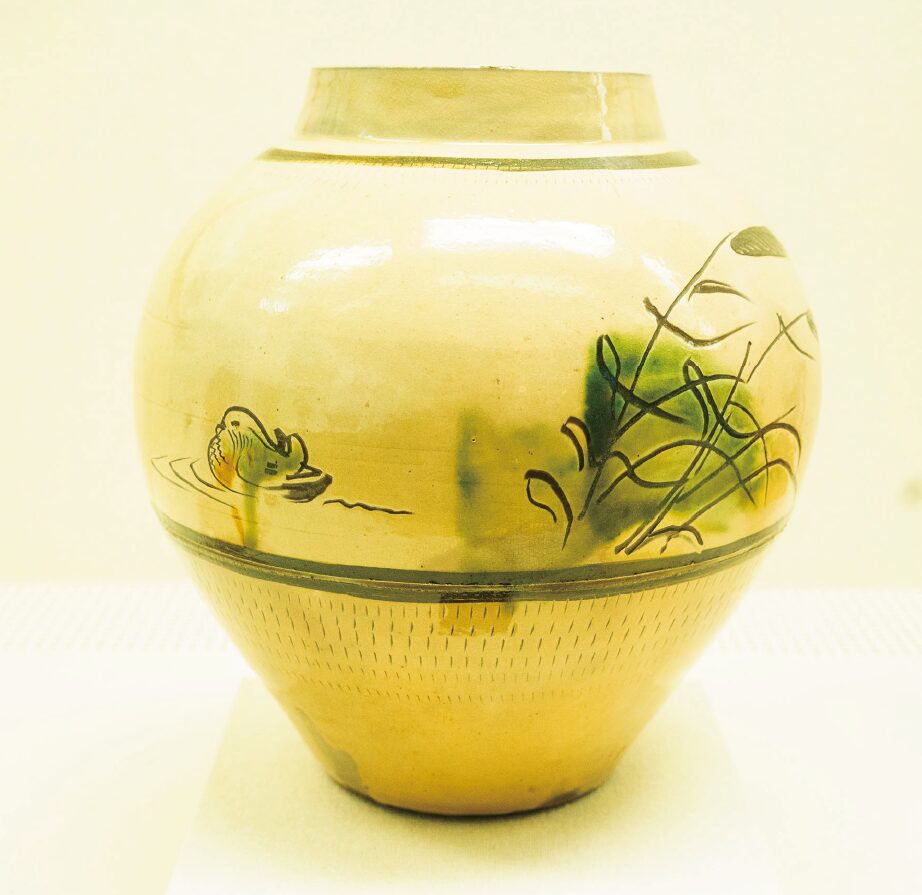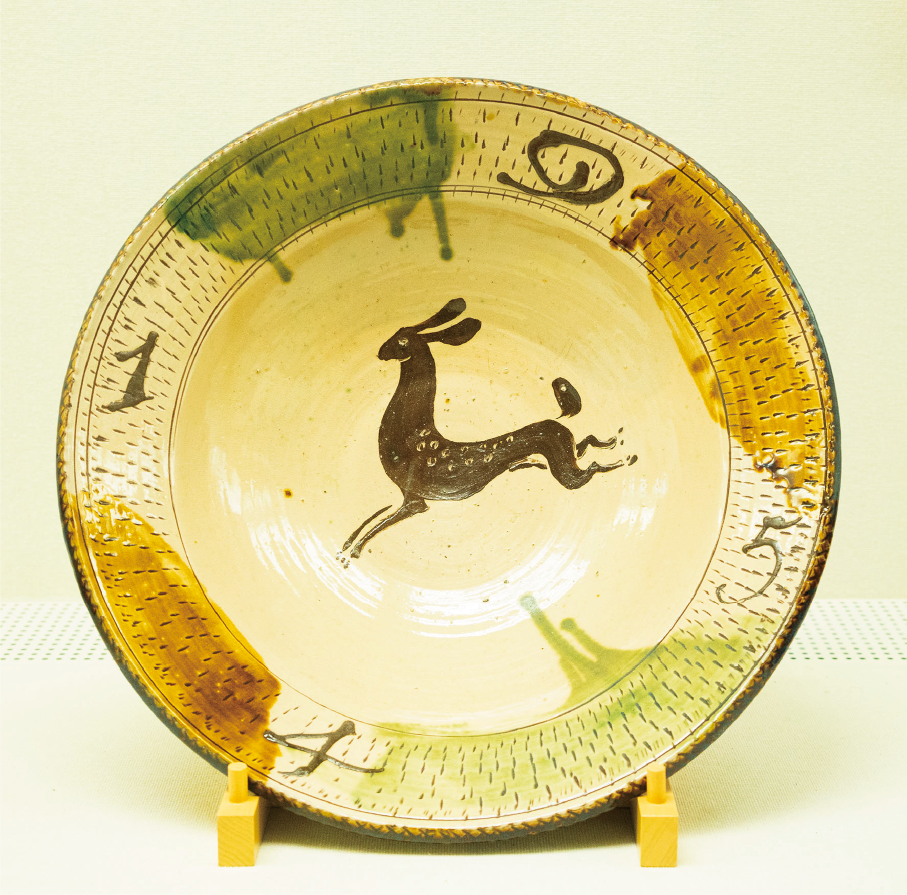 陶芸館では、リーチが1954年滞在時に制作した「壺」と「鹿文大皿」を展示しています。