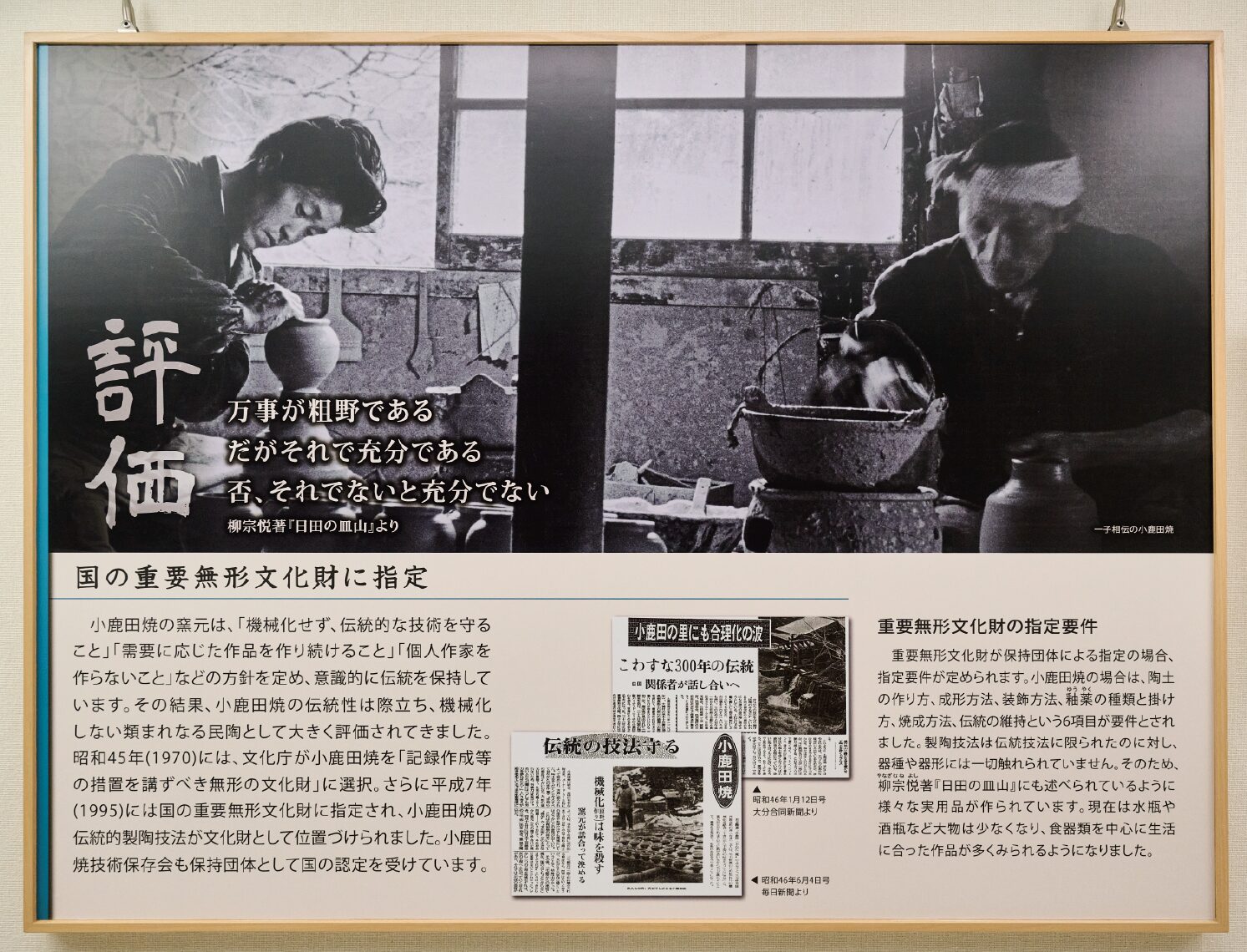 昭和36年(1961)の『民藝』5月号に、小鹿田焼の行く末を憂慮した柳宗悦の随筆が掲載されました。「今日スイスやスエーデンで、伝統の仕事が栄えてゐるのは、(中略)国民全体に国の正しい伝統を守ろうとする気運が高まってゐるからに依る。これは国家の保護よりも、どんなに根本的な鼓舞であるか分からない」と書かれており、土地固有の文化を保護する事に対し深い理解を求めていることがわかります。柳の思いがかない、昭和37年(1962)から日本民藝協会による小鹿田焼の指導が始まり、製陶技法の維持継承の方針も定められました。